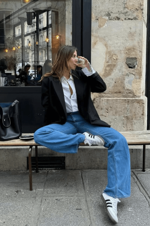 This effortlessly chic outfit pairs a crisp white button-up with an oversized black blazer for a timeless, sophisticated touch. Wide-leg blue jeans add a relaxed, vintage vibe, while Adidas Samba sneakers keep the look fresh and modern. Finished with a structured black bag, this ensemble is perfect for a stylish coffee break in the city.