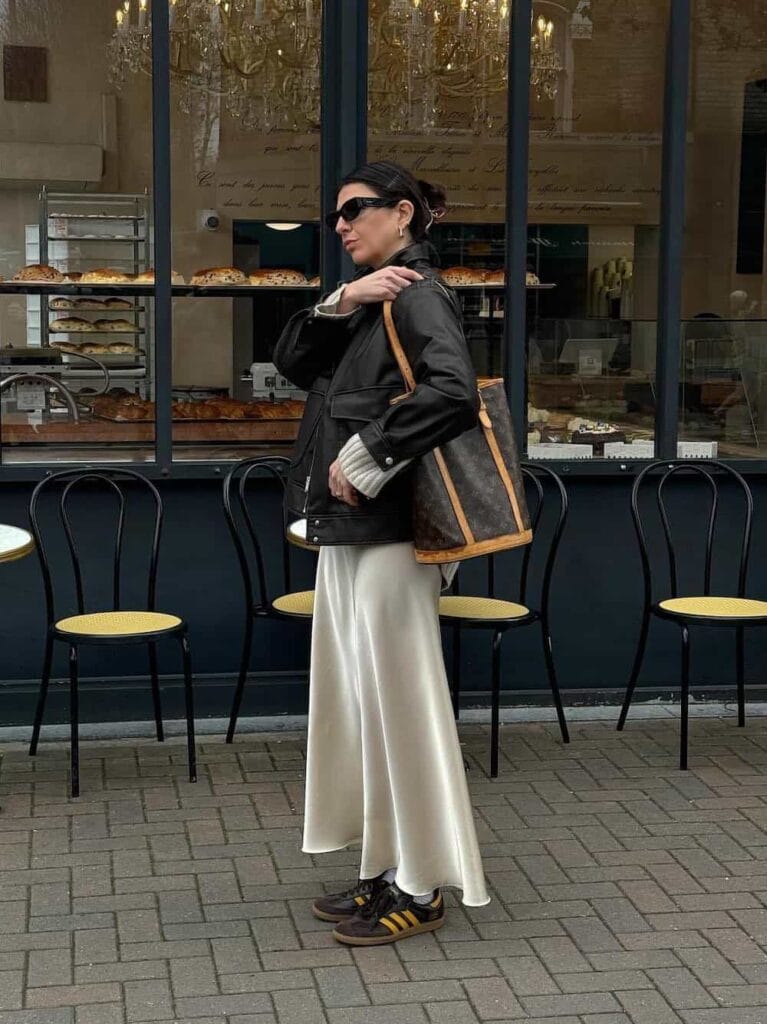 This effortlessly stylish outfit pairs a sleek black leather jacket with a flowing ivory satin skirt for the perfect balance of edgy and elegant. Dark Adidas Samba sneakers add a sporty contrast, while a classic designer tote and sleek sunglasses complete the refined street-style look. Perfect for a sophisticated cafƩ run with a modern touch.