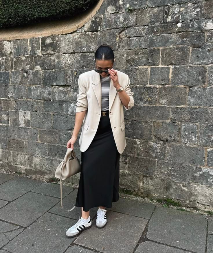 This refined yet casual look pairs a striped top with a sleek black maxi skirt for a timeless, minimalist vibe. A structured beige blazer adds sophistication, while Adidas Samba sneakers bring a sporty, modern contrast. Finished with a chic handbag and classic accessories, this outfit is perfect for an elevated everyday look.