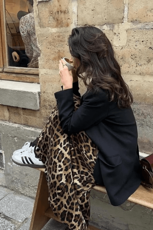 This stylish look pairs a sleek black blazer with a statement leopard-print satin skirt for the perfect mix of sophistication and edge. Adidas Samba sneakers add a casual, sporty contrast, making the outfit effortlessly cool. Perfect for a relaxed cafƩ moment with a touch of Parisian street-style flair.