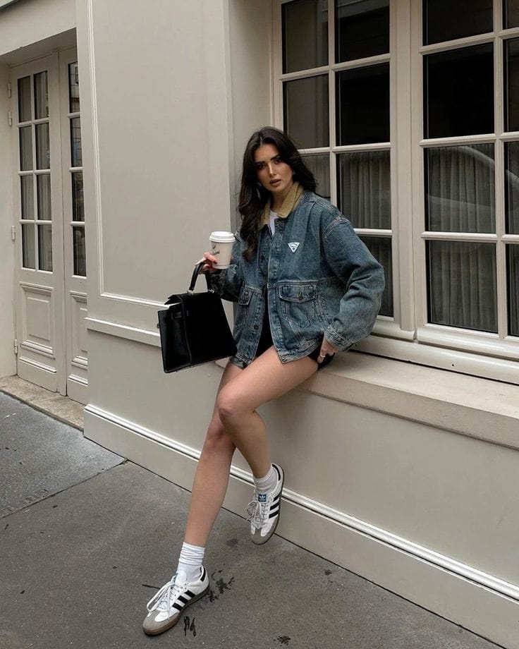 This effortlessly stylish outfit pairs an oversized vintage denim jacket with classic black shorts for a laid-back, street-style look. Adidas Samba sneakers and white crew socks add a sporty edge, while a structured black handbag brings a touch of sophistication. Perfect for a coffee run with an effortlessly cool vibe.