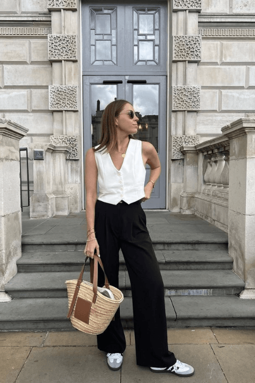 This chic black-and-white ensemble features a tailored white vest paired with flowy black wide-leg trousers, creating a polished yet easygoing silhouette. Adidas Samba sneakers add a casual, sporty twist, while the woven tote bag and gold accessories introduce warmth and texture. Perfect for an elegant yet relaxed city look.