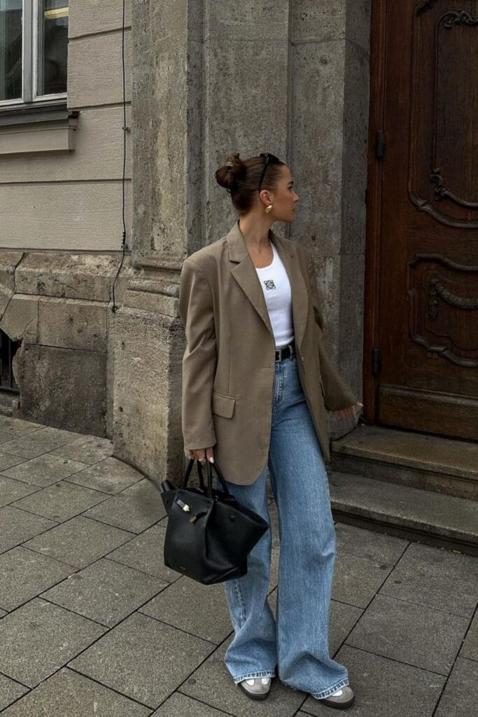 This effortlessly stylish outfit pairs an oversized taupe blazer with a classic white tank and wide-leg denim for a relaxed yet polished look. Adidas Samba sneakers add a sporty touch, balancing sophistication with casual comfort. A structured black handbag and gold accessories complete this modern, city-ready ensemble.