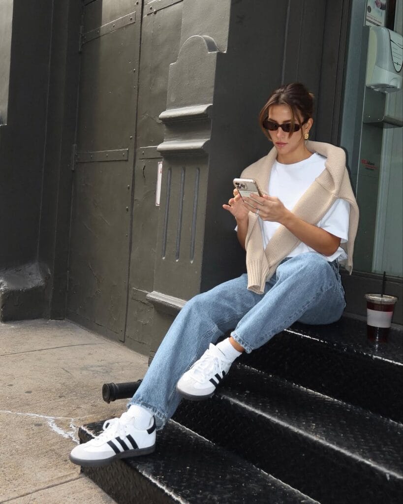 This effortless outfit blends comfort and style with a classic white tee and relaxed-fit jeans for a laid-back vibe. Adidas Samba sneakers add a sporty touch, while the beige sweater draped over the shoulders elevates the look. Minimal accessories and sleek sunglasses complete this chic, everyday ensemble.