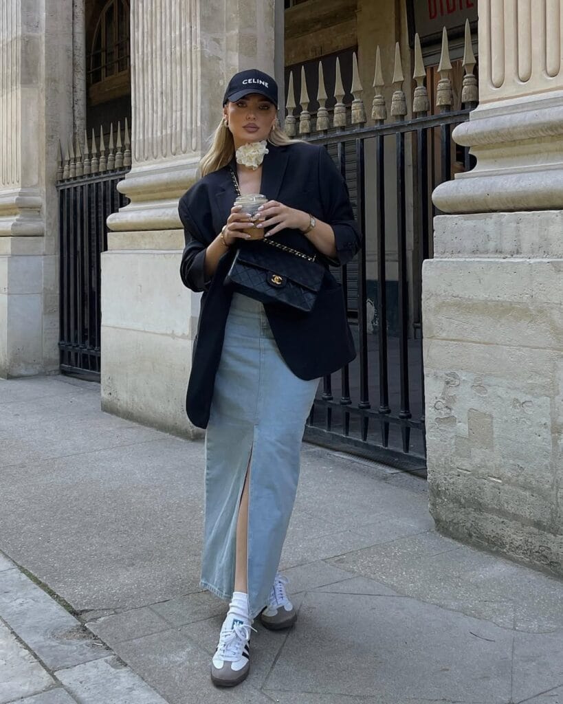 This outfit blends elegance with street style, featuring a structured black blazer over a casual denim maxi skirt with a daring slit. Adidas Samba sneakers add a sporty, laid-back feel, while a designer bag and a chic cap complete the effortlessly cool aesthetic. The floral detail adds a touch of femininity, balancing the bold and relaxed elements perfectly.