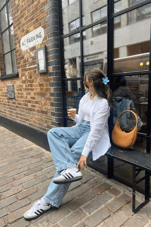 This effortlessly chic look pairs relaxed blue jeans with a classic white top and a lightweight button-up for an airy, laid-back feel. Adidas Samba sneakers add a sporty touch, while a tan handbag and a cute blue hair clip bring in soft, feminine details. Perfect for a cozy cafƩ outing with a stylish, relaxed vibe.