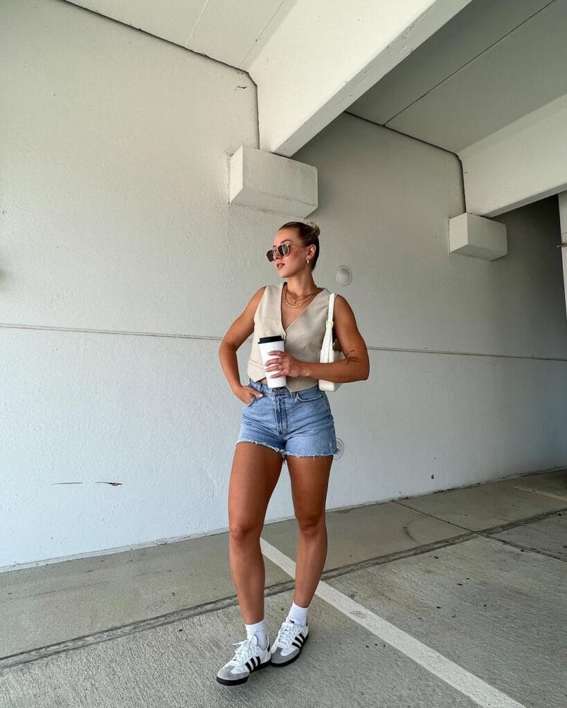 This effortlessly chic outfit pairs a cropped beige vest with classic denim shorts for a fresh and airy summer look. Adidas Samba sneakers and white socks add a sporty edge, while a sleek white bag and layered gold jewelry bring in a touch of elegance. Perfect for a stylish yet casual day out.