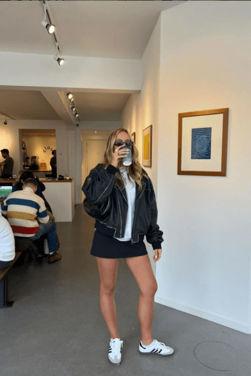 This effortlessly cool outfit features a black oversized leather jacket layered over a hoodie for a sporty yet edgy vibe. A mini skirt adds a flirty touch, while Adidas Samba sneakers keep it casual and comfortable. Perfectly styled with sunglasses and a coffee in hand for a chic, on-the-go aesthetic.