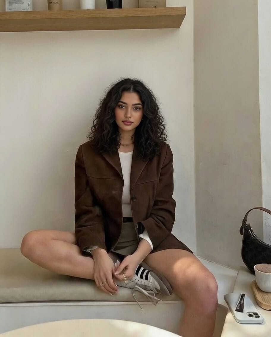 This chic and cozy look pairs a dark brown suede blazer with a neutral-toned top and tailored shorts for an elevated casual vibe. Adidas Samba sneakers bring a sporty contrast, making the outfit effortlessly stylish yet comfortable. Minimal accessories and soft lighting add to the warm, sophisticated aesthetic.
