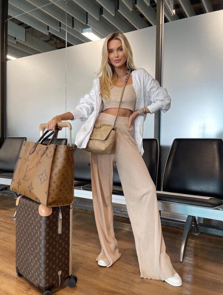 @ bianca_petryThis elegant airport outfit features a coordinated beige knit set paired with a white jacket, offering both style and comfort. Complemented by a chic Louis Vuitton tote and matching rolling suitcase, it’s the perfect ensemble for the fashion-forward traveler.