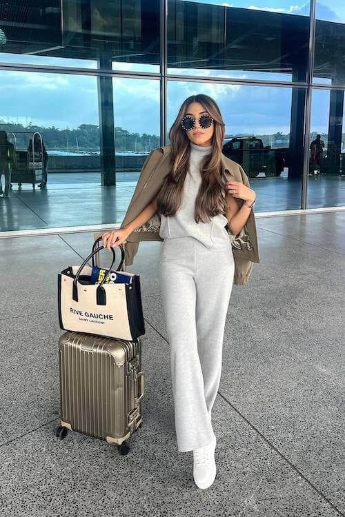 Combining comfort with elegance, this airport outfit effortlessly merges casual wear with refined style. The sleek grey jogger set is perfectly complemented by a neutral-toned blazer, adding a sophisticated touch for the discerning traveller. The oversized tote and compact carry-on suitcase round off the look, ensuring both practicality and panache.