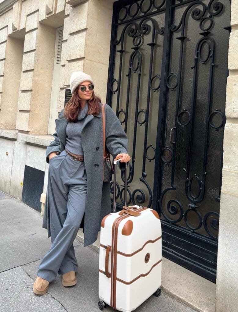 @ julia_benzyThis chic travel outfit features a stylish grey ensemble paired with a matching long coat and cozy UGG boots, perfect for staying warm and fashionable. Complemented by a classic white and brown rolling suitcase, it ensures a seamless blend of elegance and functionality for winter travel.