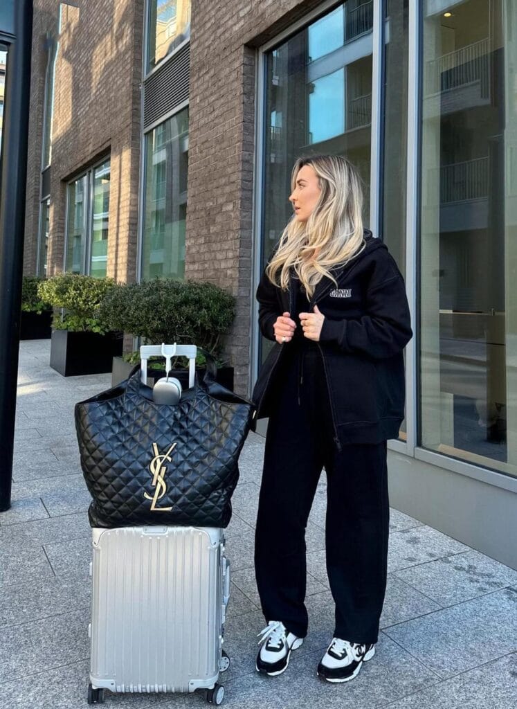 @ freyakillinThis stylish travel outfit combines a comfortable black hoodie and joggers with trendy sneakers, perfect for effortless chic. Complemented by a quilted YSL tote and a sleek silver rolling suitcase, it blends luxury and practicality seamlessly.