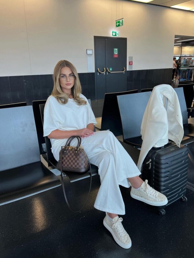@ vanesamocilanovaThis sophisticated travel outfit features an all-white ensemble with a relaxed fit, ensuring both comfort and chic style. Paired with stylish sneakers, a classic Louis Vuitton handbag, and a sleek rolling suitcase, it’s perfect for the modern traveler.
