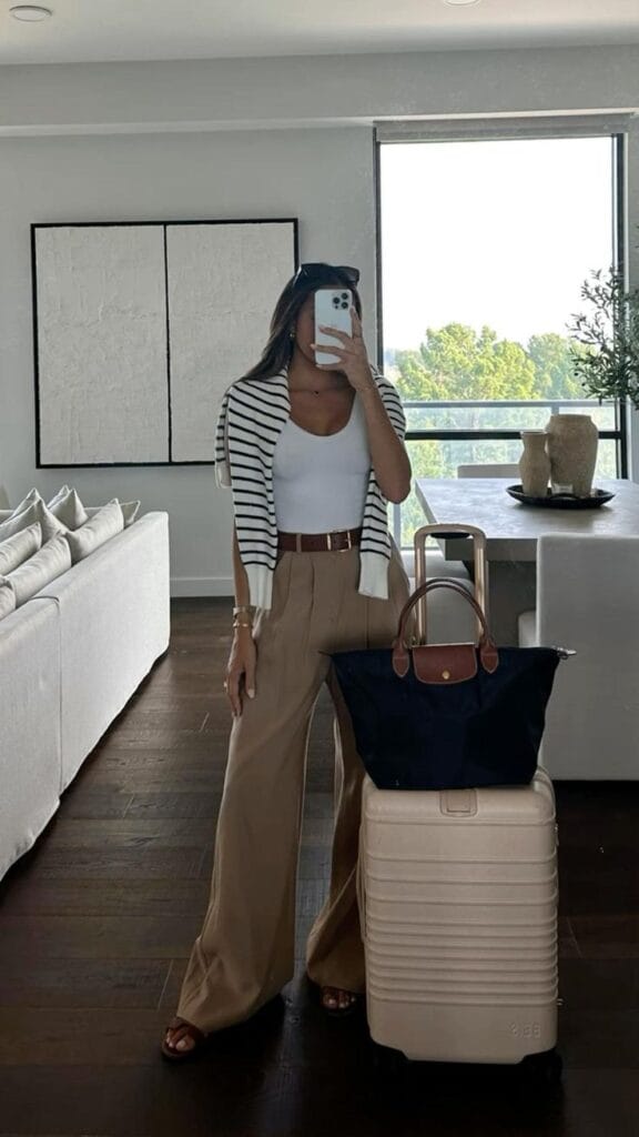 This stylish travel outfit features a classic white tank top paired with tailored beige trousers and a striped sweater, exuding effortless elegance. Completed with a chic carry-on bag and a sleek rolling suitcase, it’s perfect for the discerning traveler.