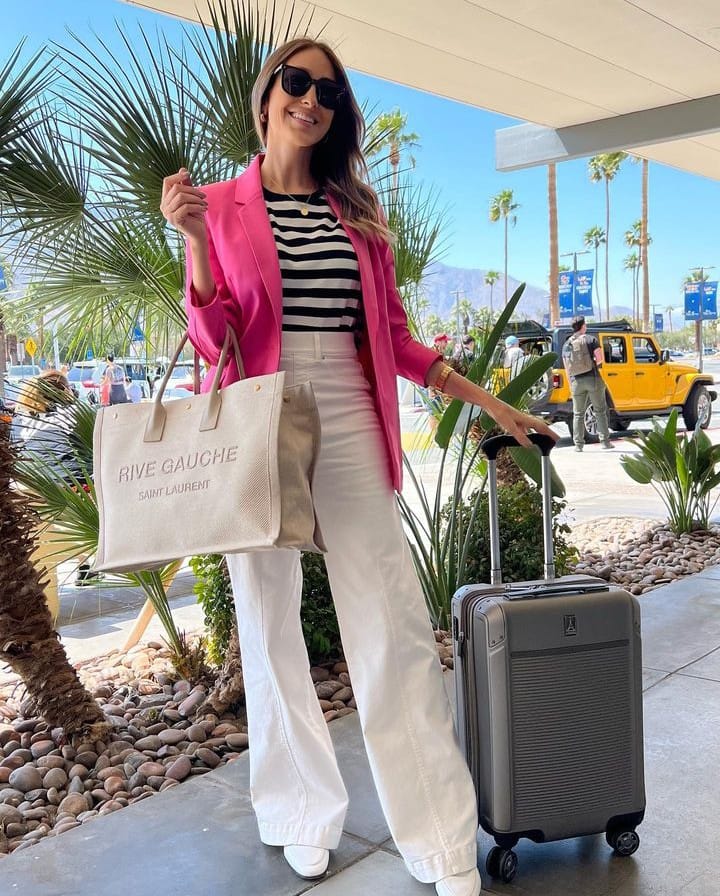 This eye-catching airport outfit features a bold pink blazer over a classic striped top and wide-leg white pants, creating a striking yet sophisticated look. With a chic Rive Gauche tote and sleek rolling suitcase, it’s the perfect blend of vibrant style and travel-ready practicality.