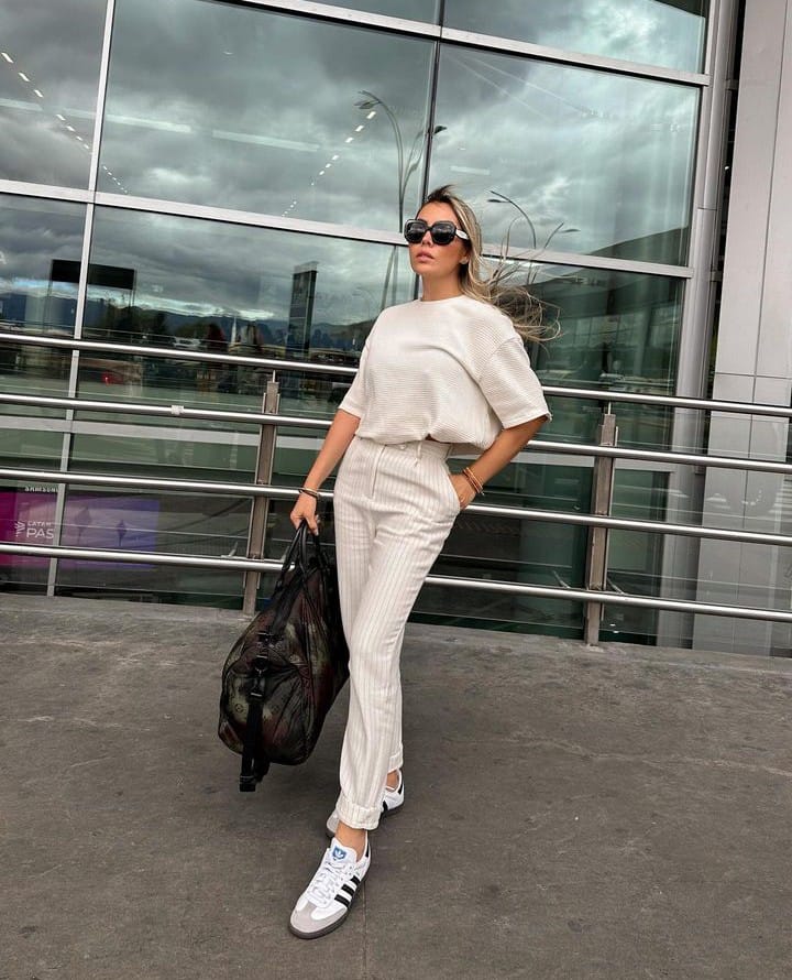 @ orlaithmelia_This chic travel outfit combines a simple white tank top with stylish, loose-fitting striped pants for a modern yet comfortable look. Complemented by a neutral tote and a sleek grey rolling suitcase, it’s perfect for effortless and elegant travel.