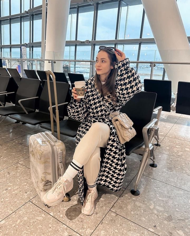 This airport ensemble features a striking houndstooth coat paired with cozy white leggings and classic sneakers, ensuring both style and comfort. Completed with a chic crossbody bag and a transparent rolling suitcase, it’s the perfect look for the fashion-forward traveler.