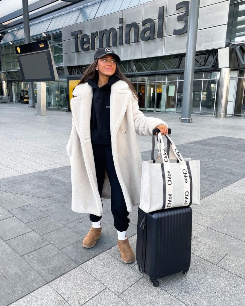 @ pheebslfashionEffortless and stylish, this travel outfit features a plush oversized coat paired with comfy joggers and trendy UGG boots, completed by a chic Chloé tote and sleek rolling luggage. Perfect for jet-setting in warmth and elegance.