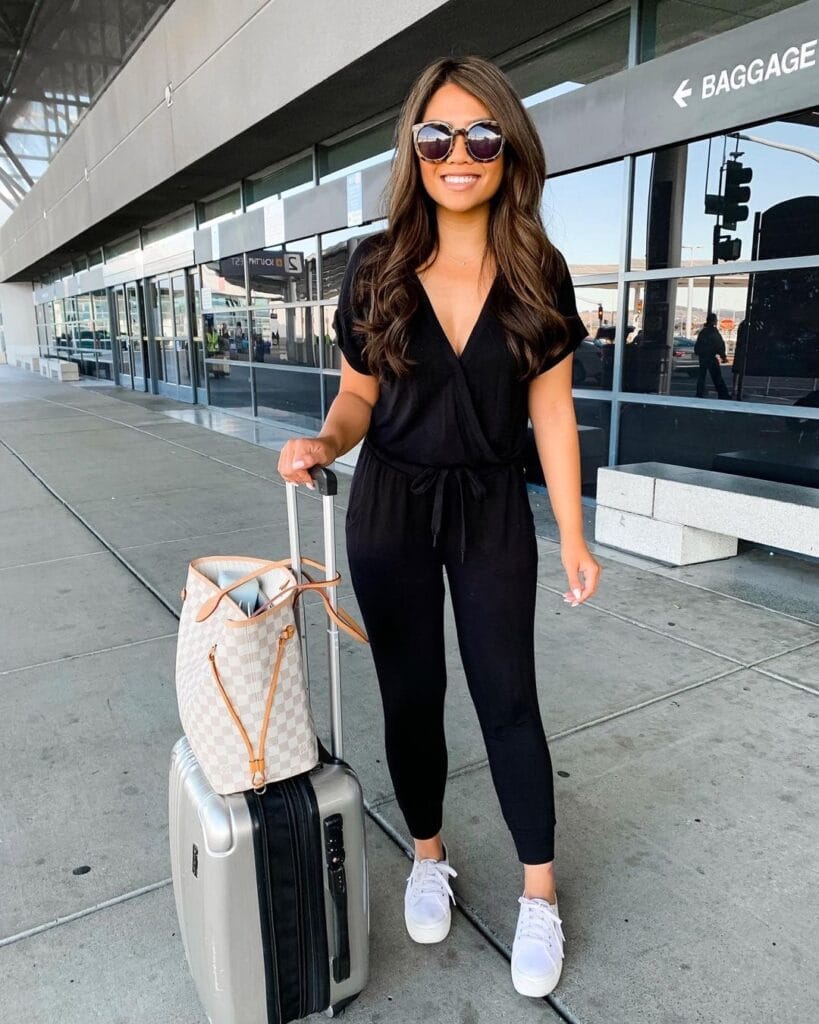 @ sweetandpetite_This stylish airport look features a sleek black jumpsuit paired with crisp white sneakers for ultimate comfort and chicness. Complemented by a luxurious checked tote and streamlined rolling suitcase, it’s the perfect ensemble for the sophisticated traveler on the go.
