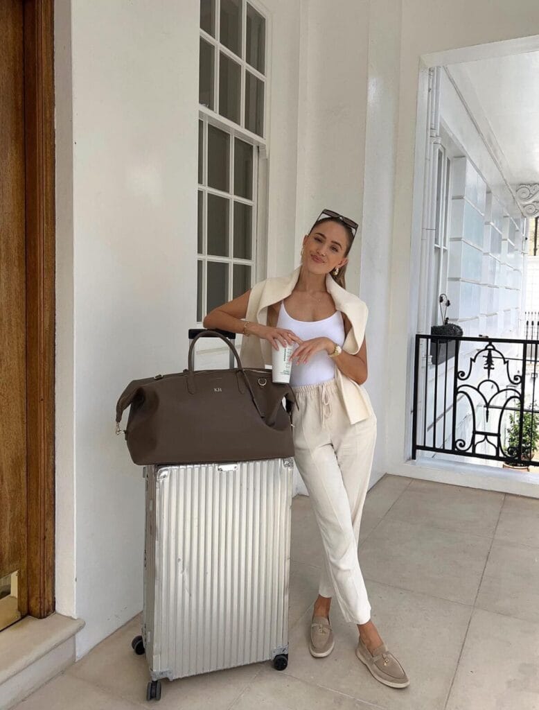 @ kateehutchinsThis chic travel ensemble features a sleek white tank top paired with cream joggers and classic loafers for a comfortable yet stylish look. Accented with a cozy sweater, a sophisticated taupe carry-on bag, and a sleek rolling suitcase, it’s perfect for the modern traveler.