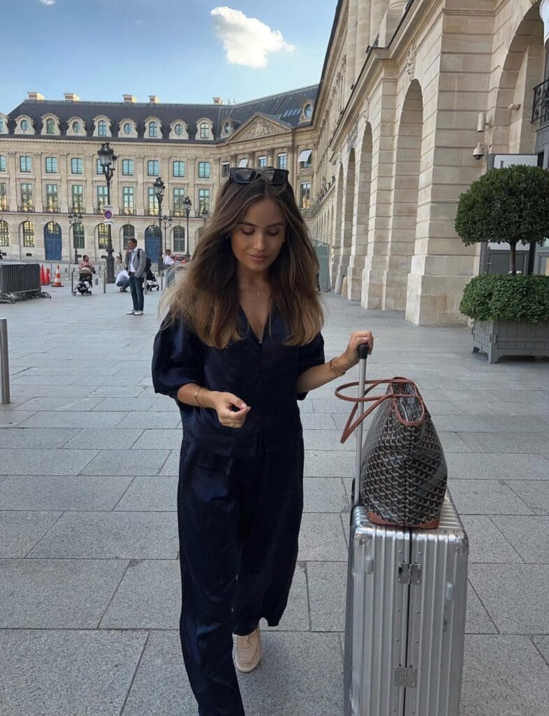 @ kateehutchinsThis elegant travel look features a sleek satin jumpsuit paired with comfortable sneakers for a chic yet relaxed vibe. Complemented by a stylish Goyard tote and a sophisticated rolling suitcase, it’s perfect for the discerning traveler.