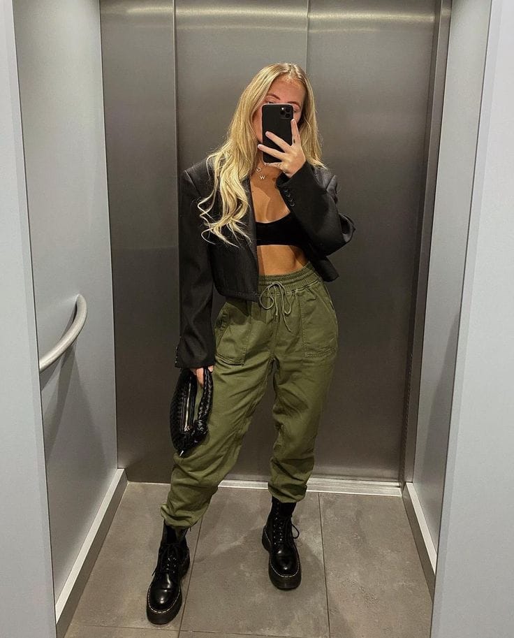 Keep it cool and casual with a cropped jacket, cargo pants, and boots.