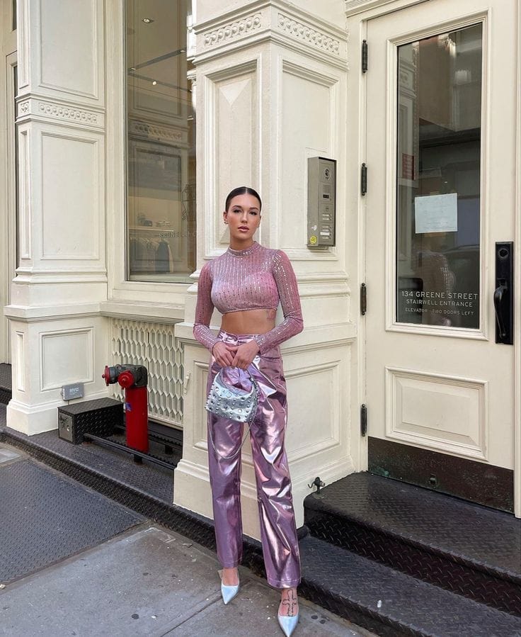Stay on-trend with a mesh turtleneck paired with metallic pants for a fashion-forward baddie look.