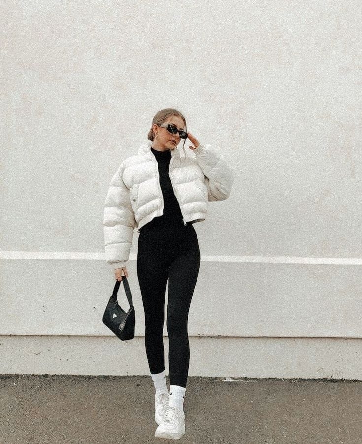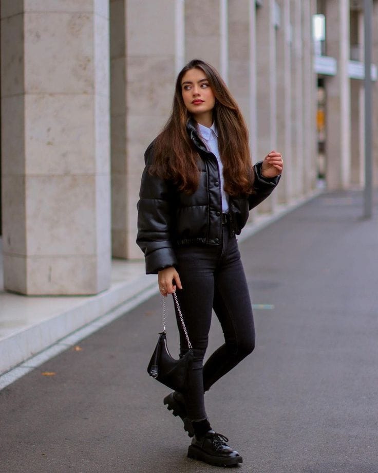 Keep it sleek and stylish with a black puffer jacket paired with black jeans for a monochrome look.