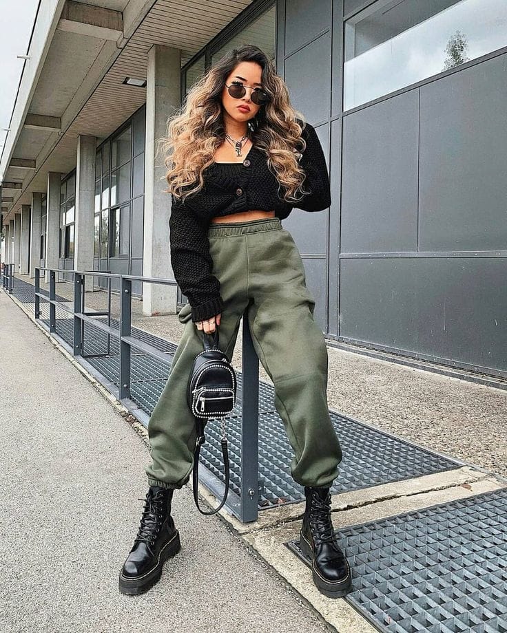 Make a statement with a sexy black top paired with cargo pants and boots for a bold and stylish look.
