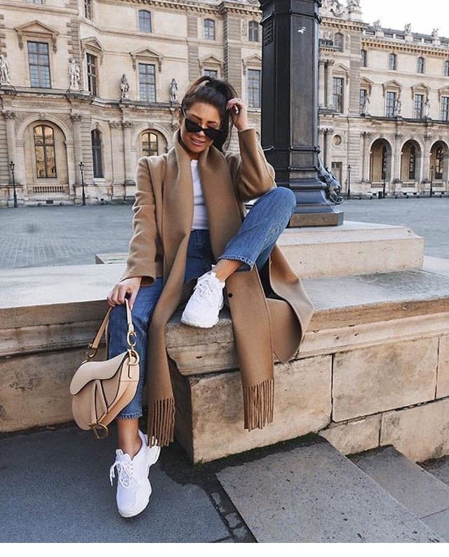 Stay effortlessly chic with a trench coat paired with jeans and white shoes for a classic and sophisticated baddie look.