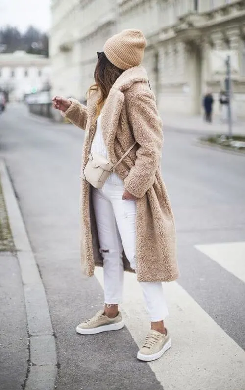 44. Beige Teddy Coat, White Sweater, White Skinny Jeans, Beanie, and Sneakers