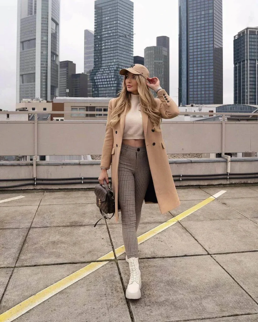 Elevate your style with a trench coat paired with plaid pants and a cap for a chic and sophisticated baddie look.