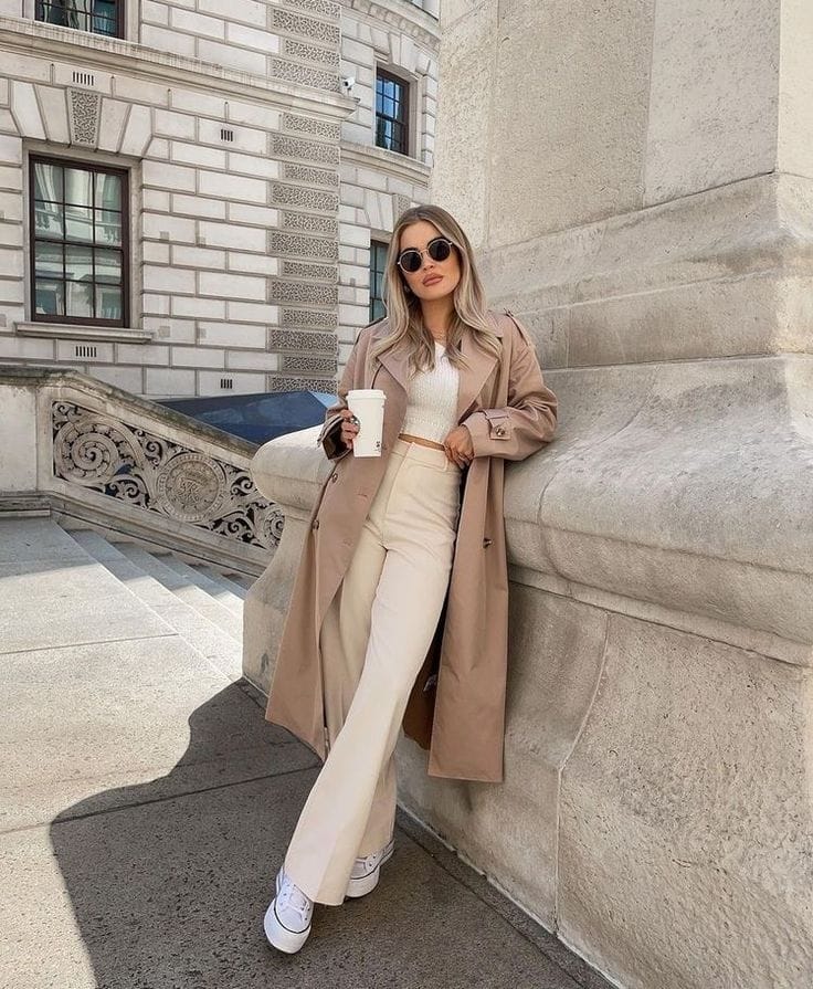 Elevate your all-beige fit with a trench coat for a sophisticated and chic baddie look.