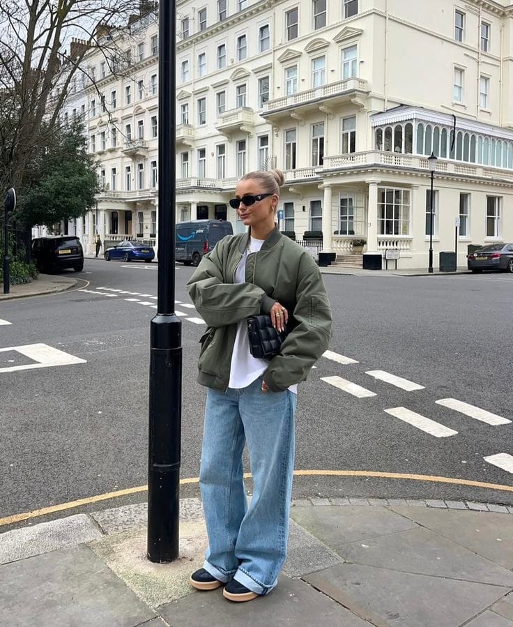 A sage green bomber jacket brings sporty warmth to this casual street look, perfectly layered over an oversized white tee. Loose-fitting, light-wash baggy jeans and platform sneakers create a laid-back silhouette, while a compact black crossbody bag keeps the vibe sleek and functional. The ideal outfit for urban adventures and effortless day-to-day comfort.