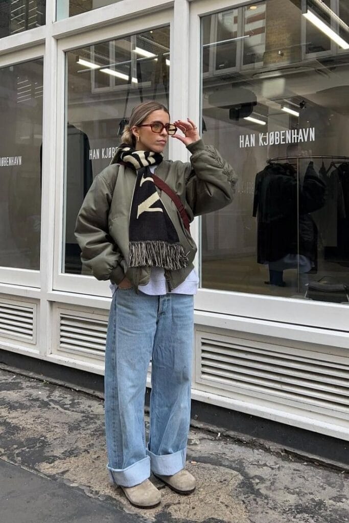 A roomy olive bomber jacket serves as the anchoring outerwear, layered over a white button-up shirt for a structured, casual vibe. Light-wash, wide-cuffed baggy jeans pair with chunky beige boots for relaxed style and urban sensibility. A graphic black scarf and brown crossbody add functional drama and personality to this cool-weather look.