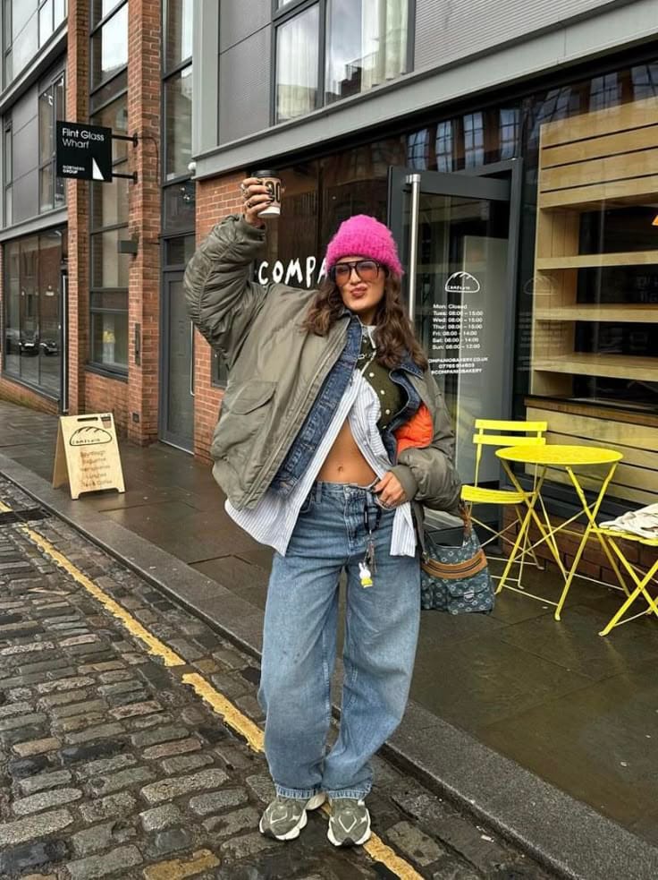 A boxy olive bomber jacket is styled with a striped blue shirt worn partially open, revealing a denim jacket and a playful bare midriff. Relaxed baggy jeans and grey sneakers bring comfort and laid-back edge. The look is finished with eclectic detailsāa bright pink beanie, designer print shoulder bag, and keychain accessoriesāmaking it a fun, youthful twist on city-casual dressing.