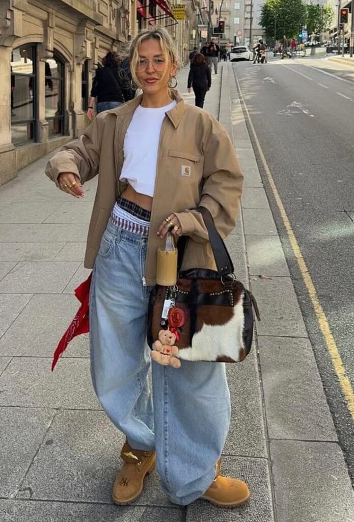 A caramel workwear jacket over a cropped white tee brings relaxed, utilitarian edge. Baggy, low-slung light-wash jeans paired with printed boxers and tan Timberland-style boots create playful, city-ready comfort. Finished with a furry statement bag, bold accessories, a red bandana accent, and iced coffee in hand, this look captures laid-back confidence and stylish street flair.