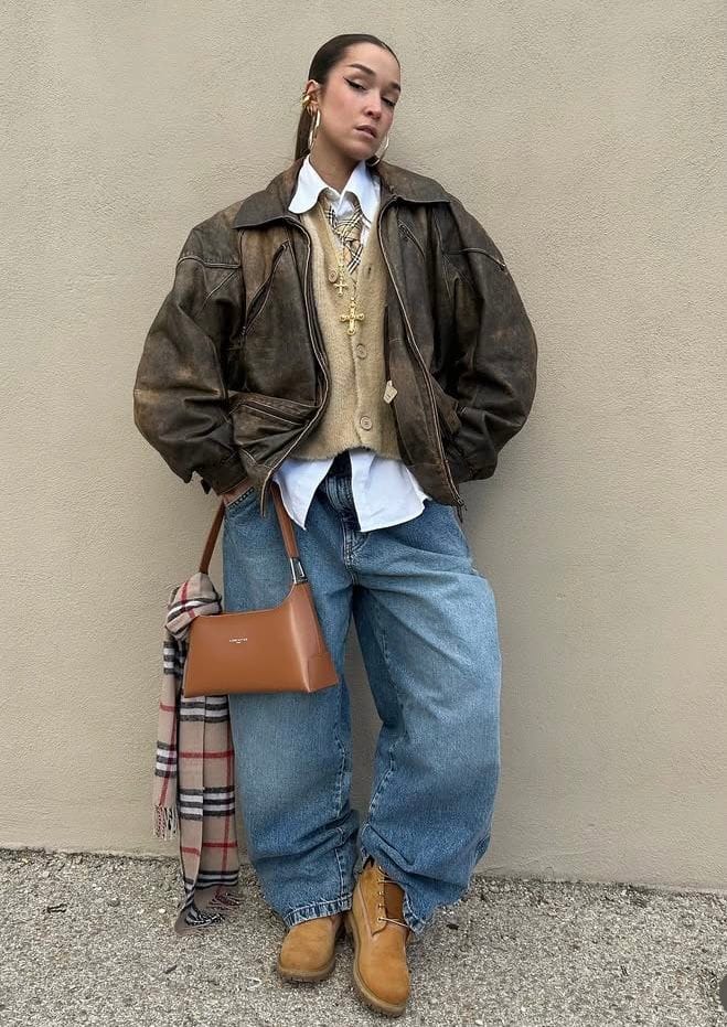 A distressed oversized leather jacket tops a light tan sweater vest and crisp white shirt, creating layered visual interest and vintage appeal. Baggy, faded blue jeans paired with classic tan boots amplify the relaxed, masculine energy. Accessoriesālike stacked gold jewelry, a brown shoulder bag, and checked scarfāadd sophisticated personality, rounding out this standout, retro-inspired city look.
