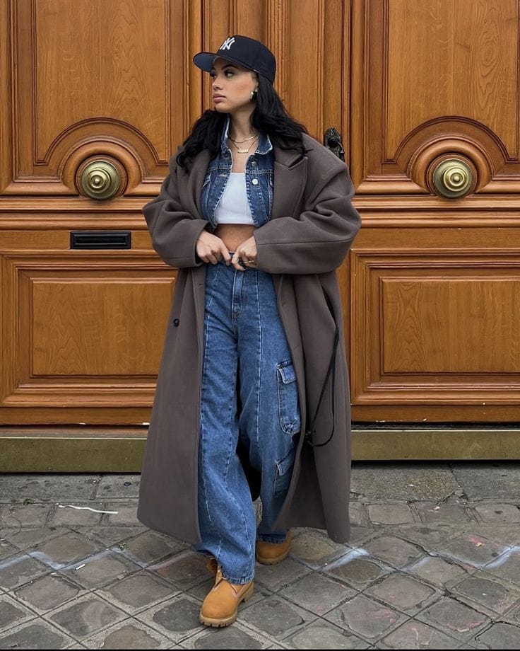 An oversized cocoa-brown overcoat gives a dramatic silhouette, layered over a cropped denim jacket and white bralette for a sporty yet feminine touch. High-waisted, baggy cargo jeans add utilitarian edgeāpaired with classic tan Timberland-style boots for a grounded finish. The look is completed by a dark baseball cap and subtle jewelry, fusing athletic inspiration with urban chic.