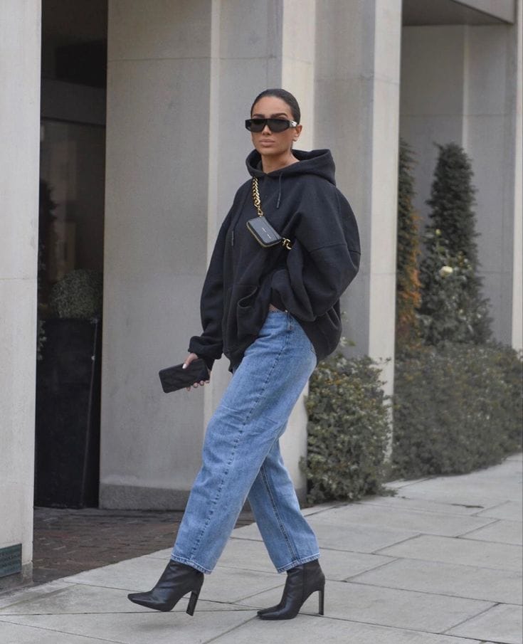 An oversized black hoodie sets the tone for a cozy yet elevated silhouette, paired with classic straight-cut light blue baggy jeans. Sleek black stiletto ankle boots add a sophisticated twist for an urban edge. Finished off with bold gold accessories, including a crossbody with chain strap and understated clutch, this look strikes a perfect balance between laid-back comfort and polished street style.