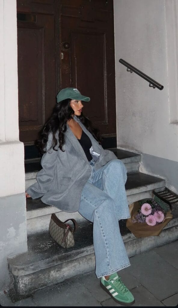 A slouchy, oversized light grey blazer is paired with a simple black top underneath for a relaxed yet sophisticated feel. Light-wash, straight-fit baggy jeans and green Adidas sneakers add a sporty street edge. Accessories like a sage green cap and classic monogram handbag, along with a bunch of fresh flowers, give the outfit a playful, casual urban vibe.
