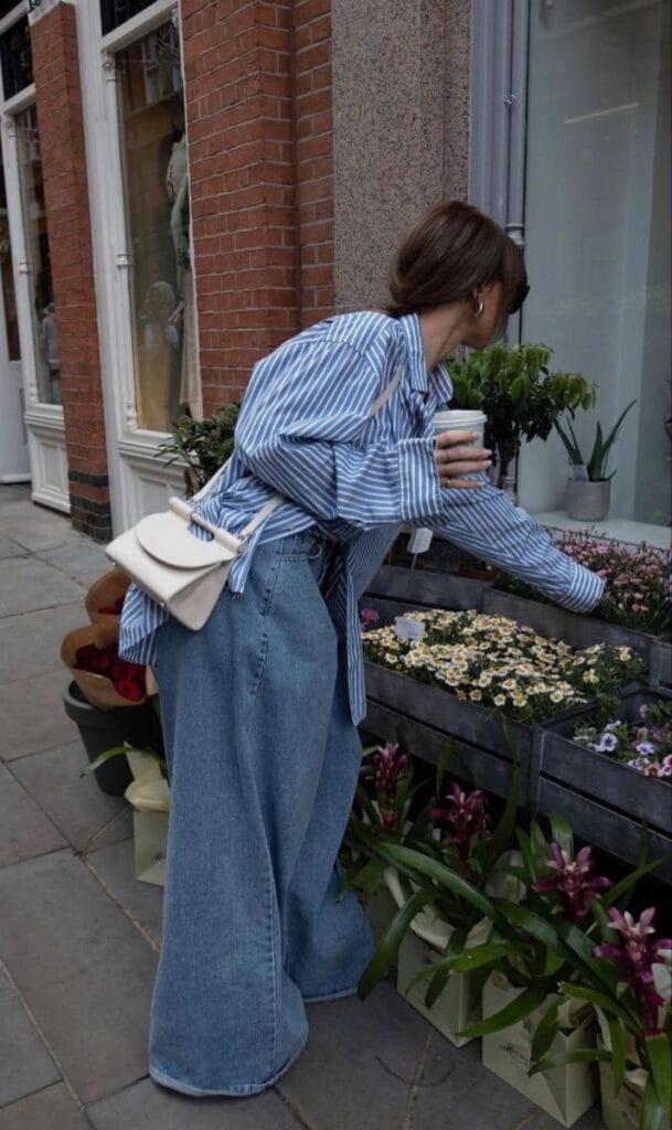 An oversized blue-and-white striped button-down shirt delivers effortless sophistication, worn with very wide-leg light wash jeans for a comfortable, flowy silhouette. A small, creamy white shoulder bag and silver earrings add subtle feminine accents. Finished with a coffee cup in hand, this look is perfect for enjoying casual city moments among fresh flowers.