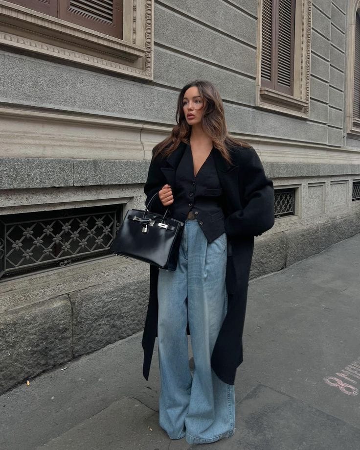 A structured black coat layered over a black blazer and deep V-neck top creates a dramatic and polished upper silhouette. Pale blue wide-leg baggy jeans add casual softness and contrast, balancing the all-black upper half. The ensemble is finished with a luxurious black handbag for an elegant touch, making this a refined yet modern city look.