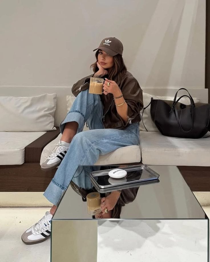 This outfit nails the relaxed, streetwise coffee shop look by combining a chocolate brown Adidas cap and cropped brown leather jacket with loose, light-wash baggy jeans. Classic Adidas Samba sneakers in white and black keep the look casual and comfy. Simple gold jewelry, a large black tote, and a latte complete the easy, cool urban vibe, perfect for a casual meet-up or lounging in style.