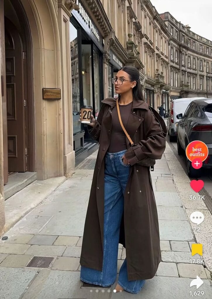 A long, oversized chocolate-brown trench coat creates a dramatic statement layered over a fitted cocoa top and classic blue wide-leg baggy jeans. The look is grounded with platform shoes peeking out beneath the denim and accessorized with a compact crossbody bag in dusty pink.