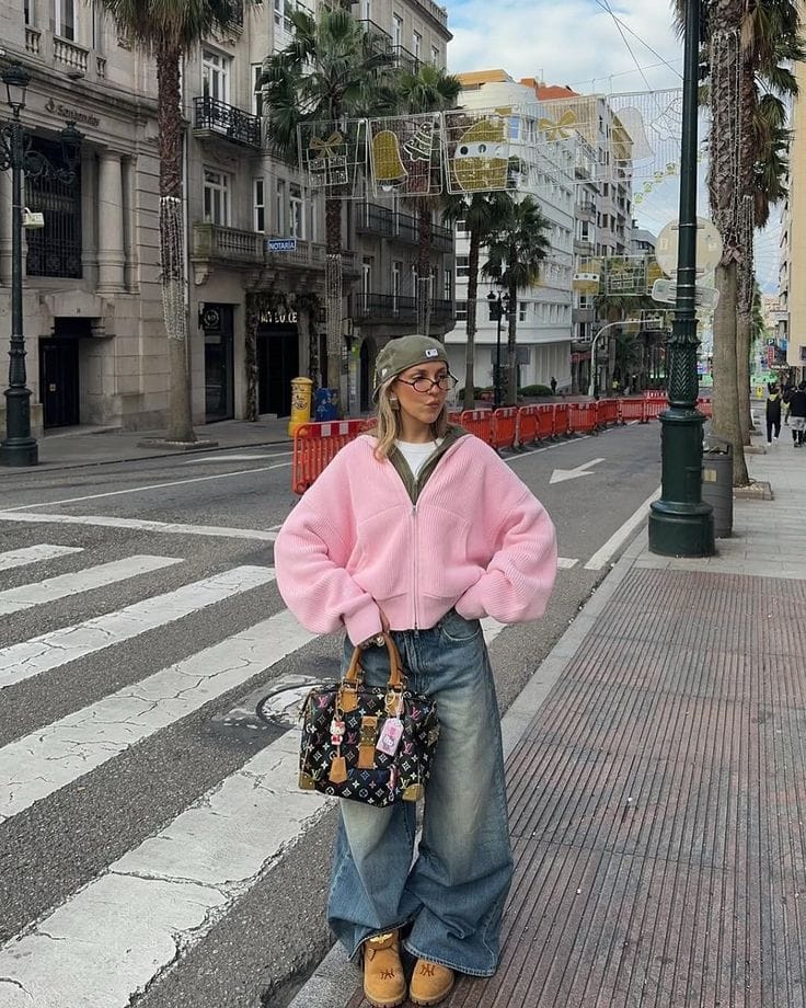 A pastel pink zip-up teddy jacket brings cheerful color and cozy texture to this look, layered over a neutral olive green top. The extra baggy, floor-length jeans make a bold statement, contrasted with classic tan Timberland-style boots for a sturdy street edge. A logo print bag decorated with playful keychains and an army-green baseball cap top off this fun, Y2K-inspired urban outfit.
