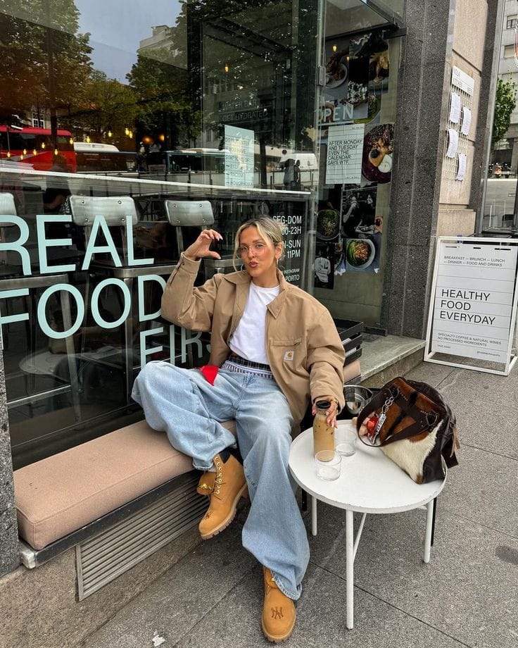 A tan Carhartt work jacket gives this look utilitarian charm, layered over a crisp white tee for casual ease. The baggy, light blue jeans and classic Timberland boots channel laid-back workwear, perfect for city strolls. Accessories include an oversized brown patchwork tote for function and style.