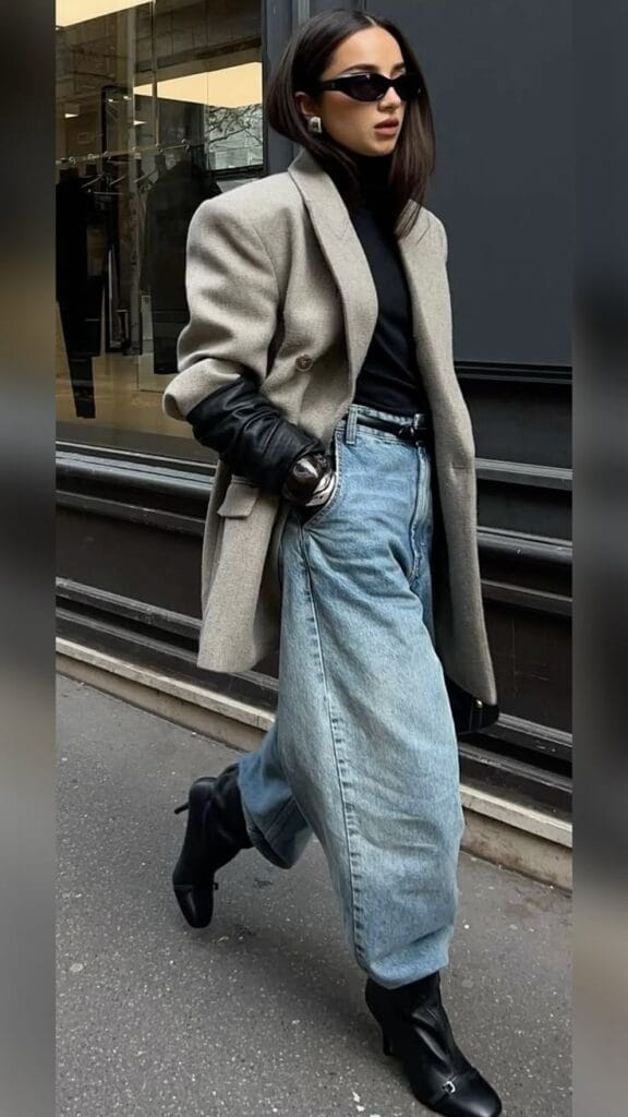 This look features a structured, oversized light beige blazer worn over a sleek black turtleneck for a polished urban feel. Light-wash baggy jeans give the outfit a relaxed balance, while black pointed-toe ankle boots and glossy black gloves provide sophisticated contrast and edge.