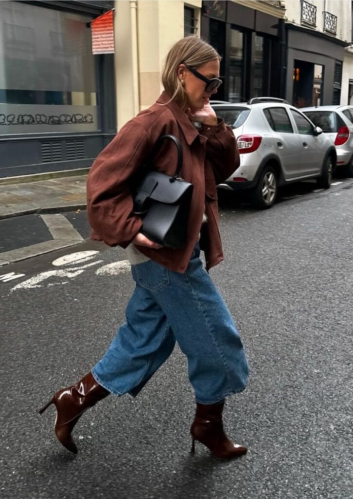 An oversized brown shirt jacket brings a relaxed, modern feel to classic cropped baggy jeans. Glossy brown stiletto boots add Parisian sophistication and elevate the street-style look. The structured black handbag and bold sunglasses complete this effortless, city-ready ensemble.